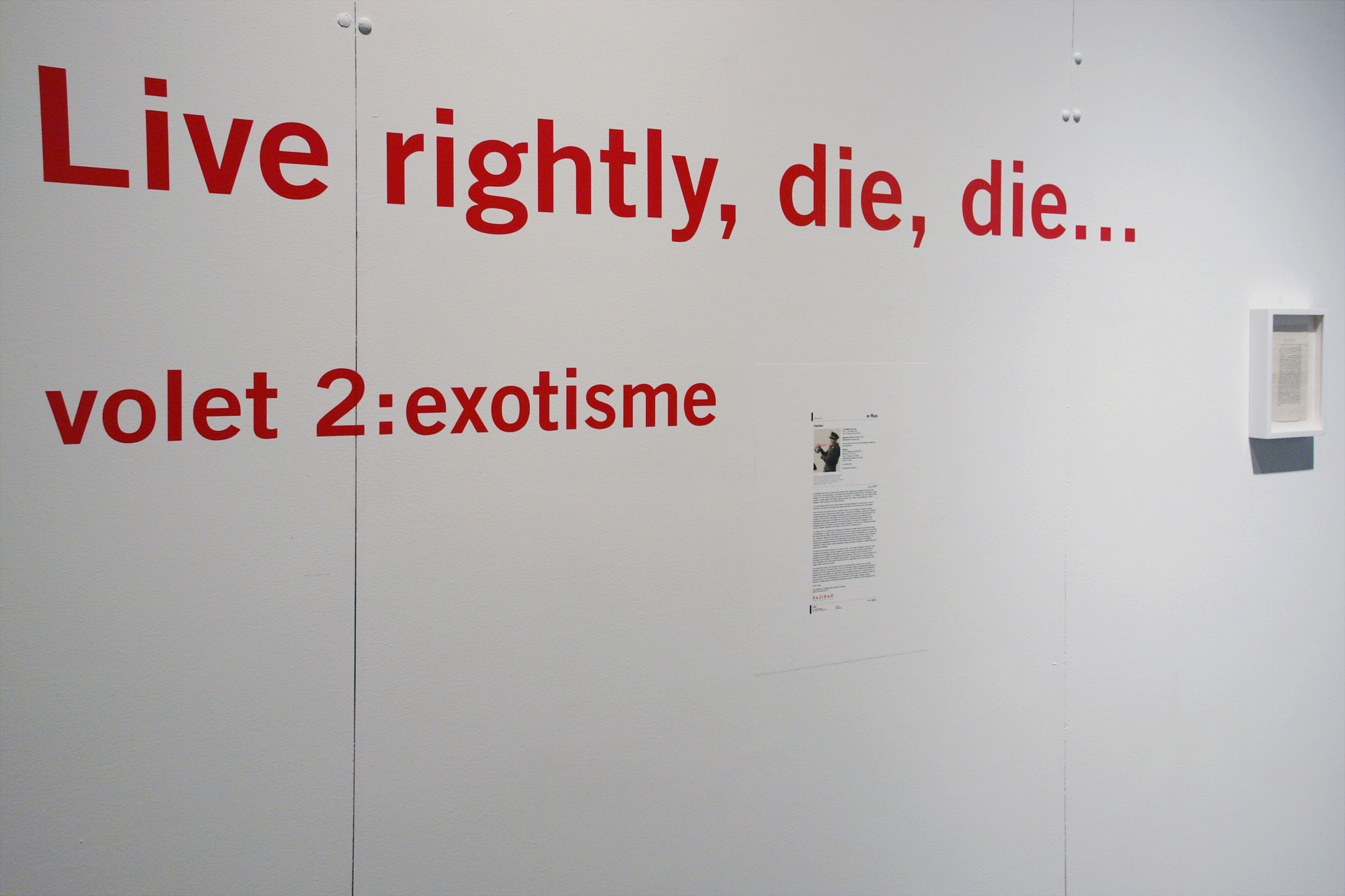 A two-part exhibition and a publication uniting artworks, artifacts and documents focusing on the theme of artistic tourism and the exotic in contemporary art. Exhibition presented by Dazibao in residence at the Cinémathèque québécoise, Montreal, 2012.